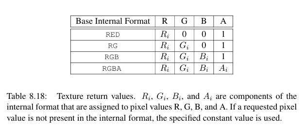当纹理的内部格式和读取的format并不完全对应时,各个分量的填充处理如表格所示: